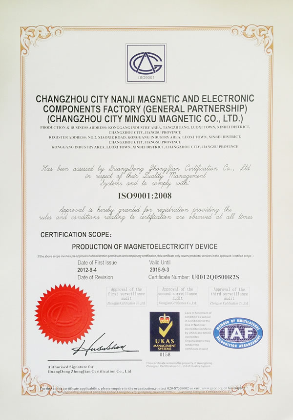 ISO9001 U0012Q0500R2S Magnetoelektrisches Gerät IAF 2012-09-04--2015-09-03 |